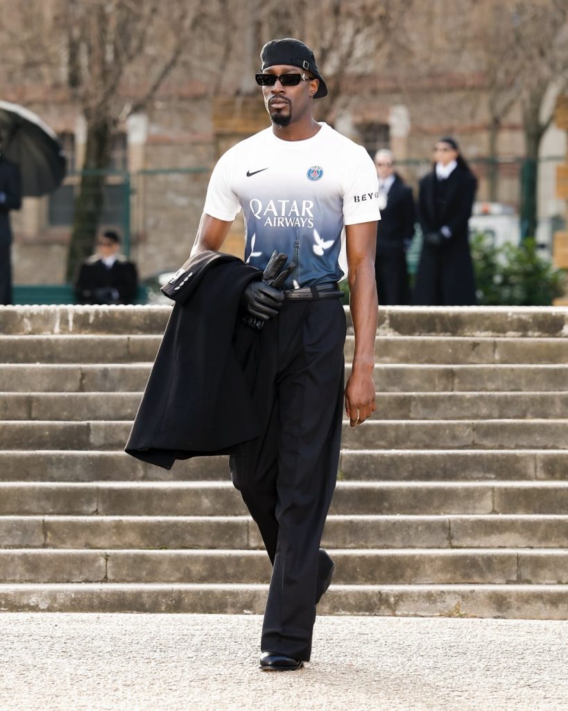 Pour l’automne-hiver 2026, le maillot se pare des hirondelles signatures de 3.Paradis, flottant autour de la Tour Eiffel sur un ciel sombre. Présentée sur le podium comme une pièce de mode à part entière, portée avec un pantalon de costume, cette création brouille encore davantage les frontières entre vêtement sportif et vestiaire urbain.