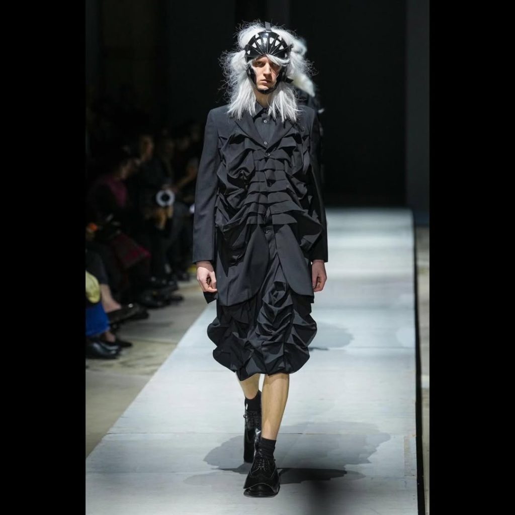 Une approche minimaliste et conceptuelle, fidèle à l’esthétique du créateur japonais, où la chaussure devient un élément discret mais structurant de la silhouette.