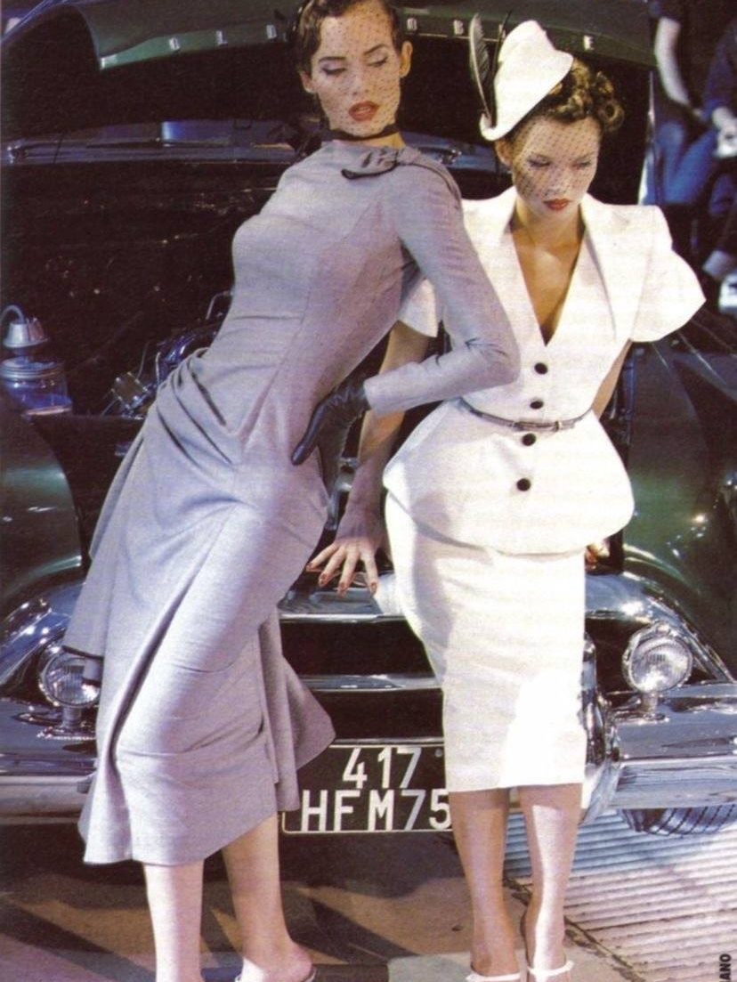 Au centre du podium trône une Cadillac des années 1950, autour de laquelle gravitent mannequins et figurants. Deux hommes installés dans la voiture servent de faire-valoir : Galliano détourne ainsi le regard masculin pour mieux en révéler les codes.