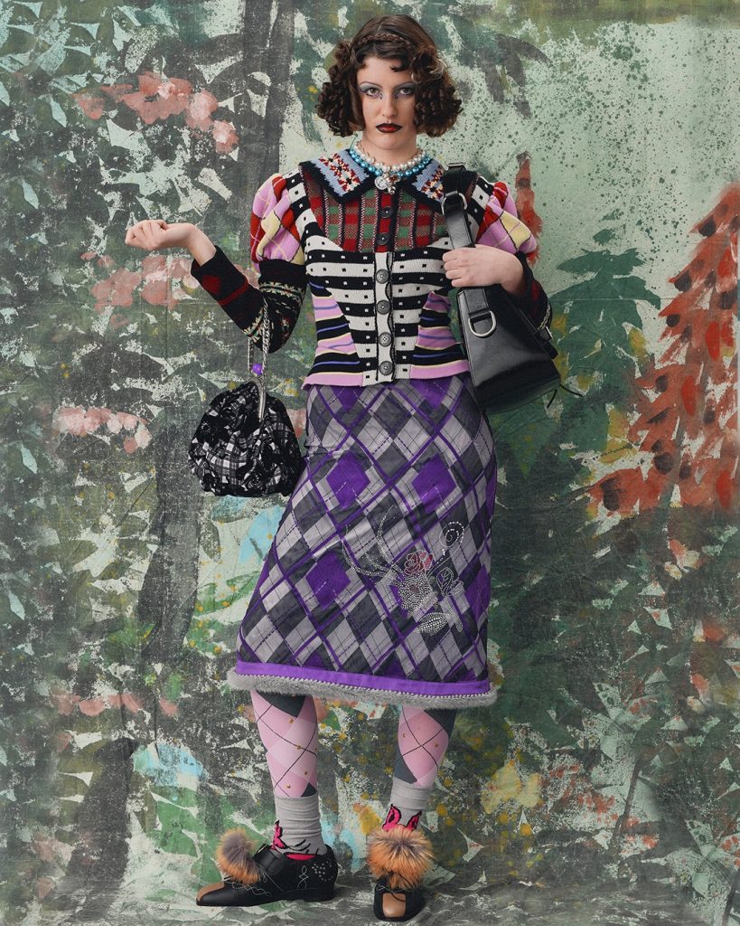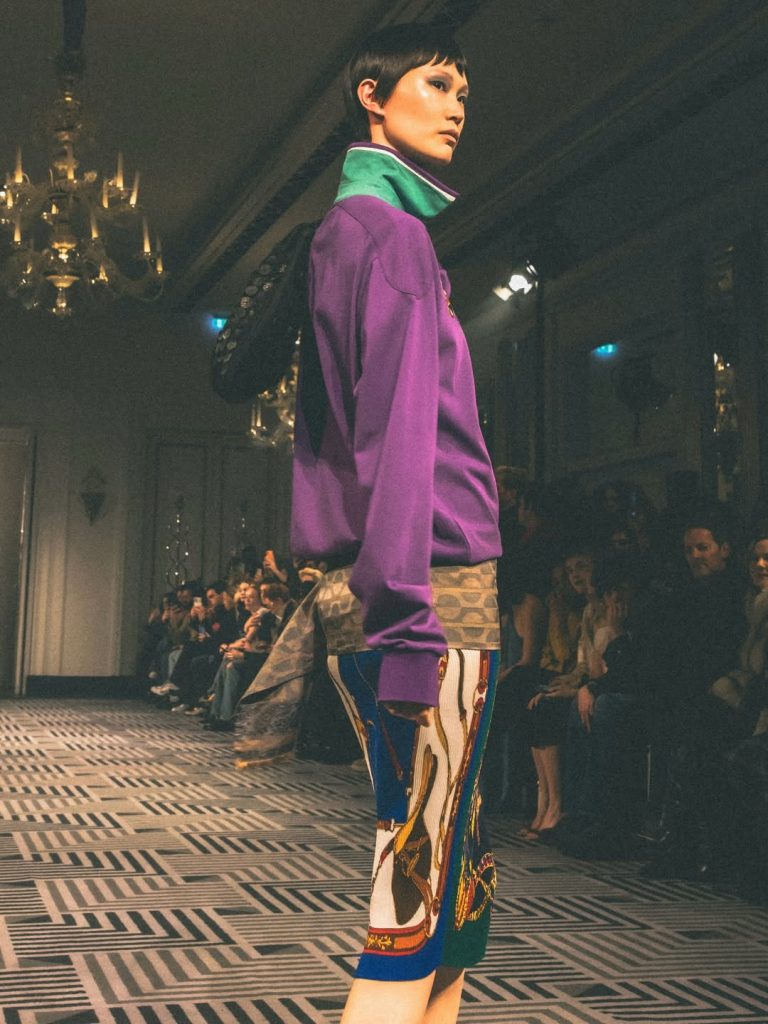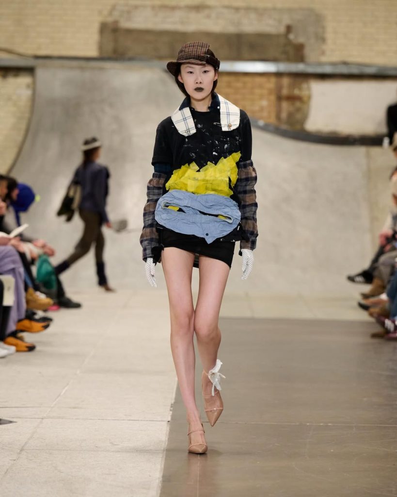Chez Chopova Lowena, les influences multiples se savourent quelque part entre le regency core et une matinée sur un green impeccablement tondu. Les jupes plissées, signatures du duo, sont bien présentes, mais derrière ce design se cache avant tout une approche circulaire reposant sur la réutilisation de pièces issues d’anciennes collections.