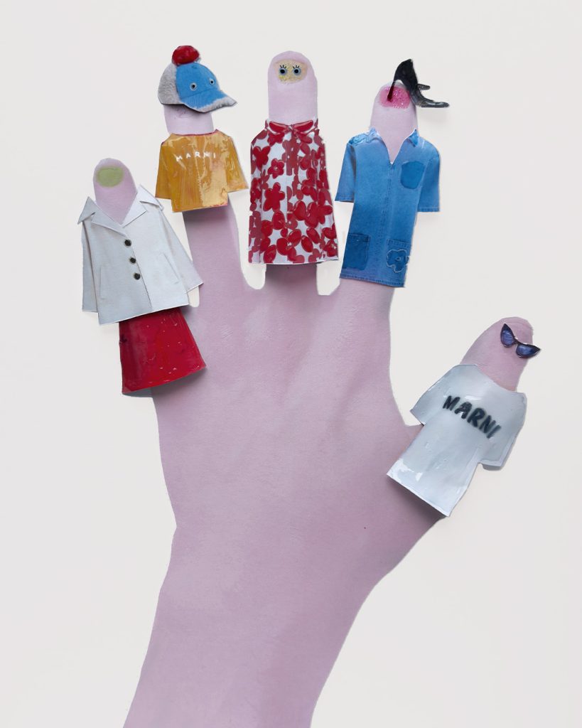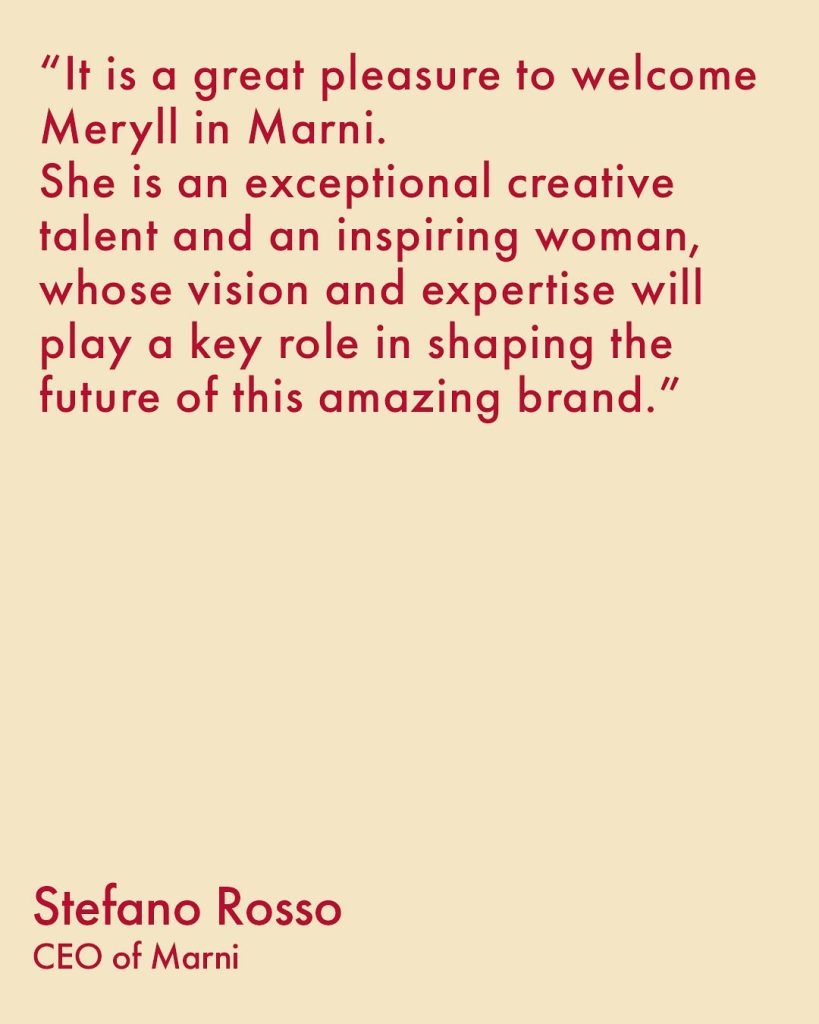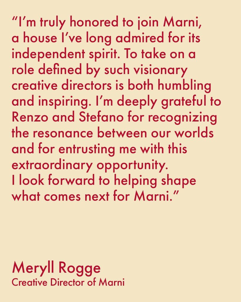 Avec Meryll Rogge, la filiation semble évidente : même goût pour l’imparfait, même envie de jouer avec les volumes, les matières, les références culturelles. Son approche ludique, parfois surréaliste, devrait parfaitement s’accorder avec l’ADN poétique et décalé de Marni.