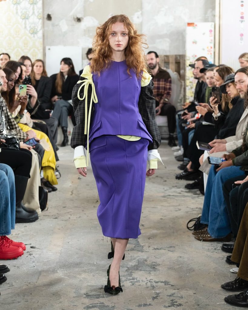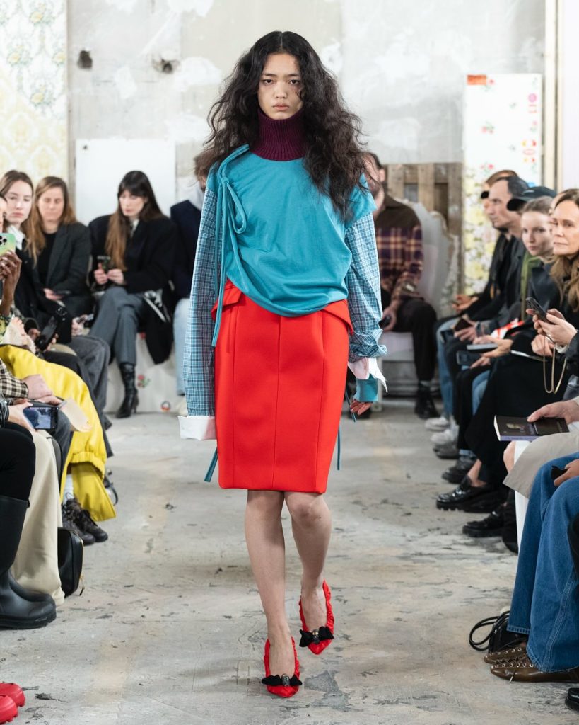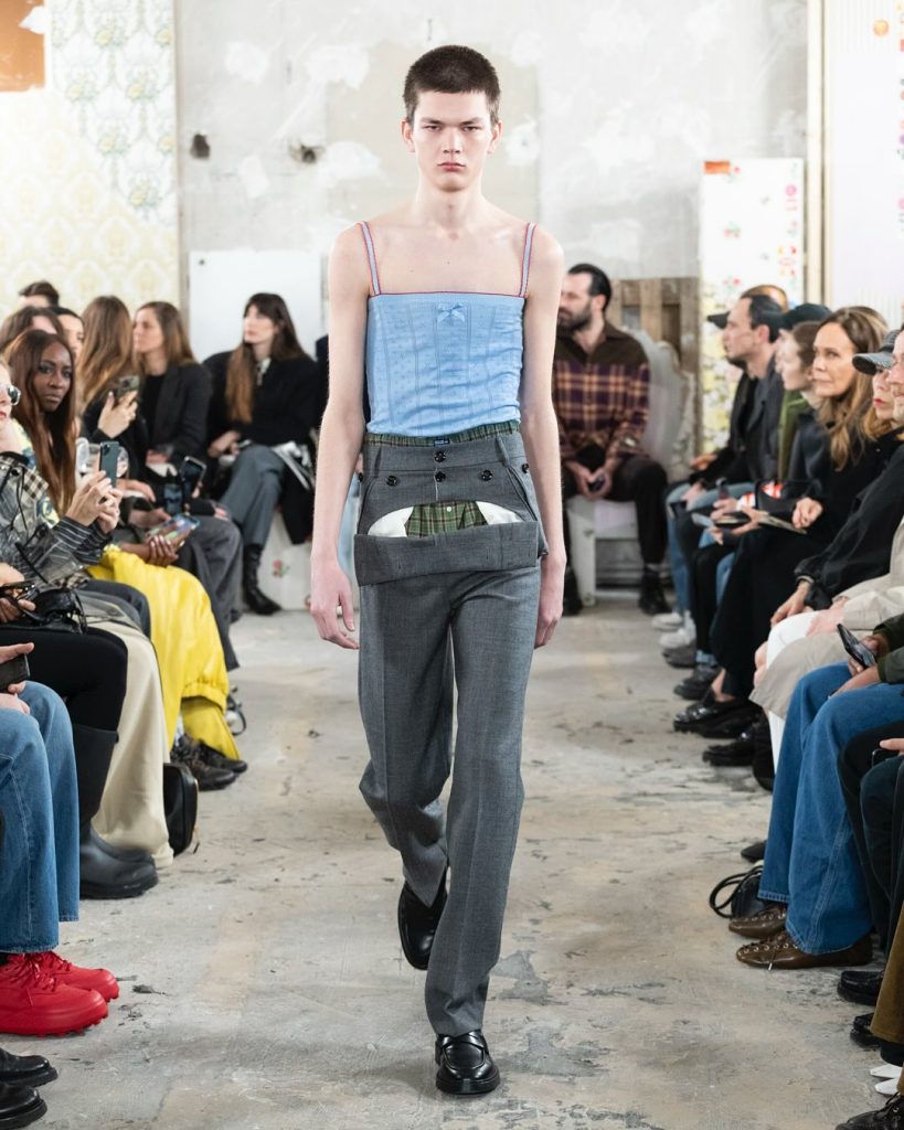 Chaque pièce raconte une histoire, comme ce pantalon à découpe inversée qui évoque un tablier retourné. Derrière l’effet de style, une réflexion sur le passage du temps et la mémoire des matières. Et surtout, un engagement : la créatrice travaille avec des stocks dormants et pratique l’upcycling, dans une approche responsable qui fait écho aux engagements locaux de Marni, qui fabrique encore dans ses propres ateliers en Italie.