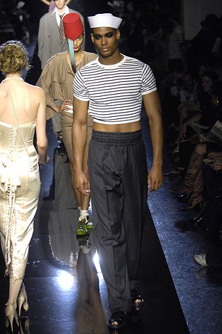 le sailor look chez Gaultier détourne l’imaginaire militaire pour proposer une masculinité queer, sensuelle, exubérante, théâtrale. Un retournement complet des codes virils.Aujourd’hui encore, la maison, désormais pilotée par Duran Lantink, continue d’en proposer des interprétations en cuir, denim ou rayures. Le chapeau de marin demeure un marqueur immédiat de l’univers Gaultier.