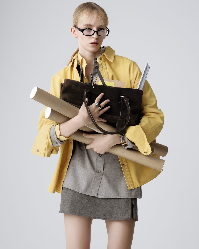Troisième pièce forte : le Shell Brot, cabas semi-rigide, ici décliné dans un jaune moutarde éclatant. Pensé pour être porté à la main ou sous le bras, il impose une allure manifeste. Tous ces modèles se déclinent en deux tailles, preuve de l’attention portée au quotidien sans compromettre l’esthétique.