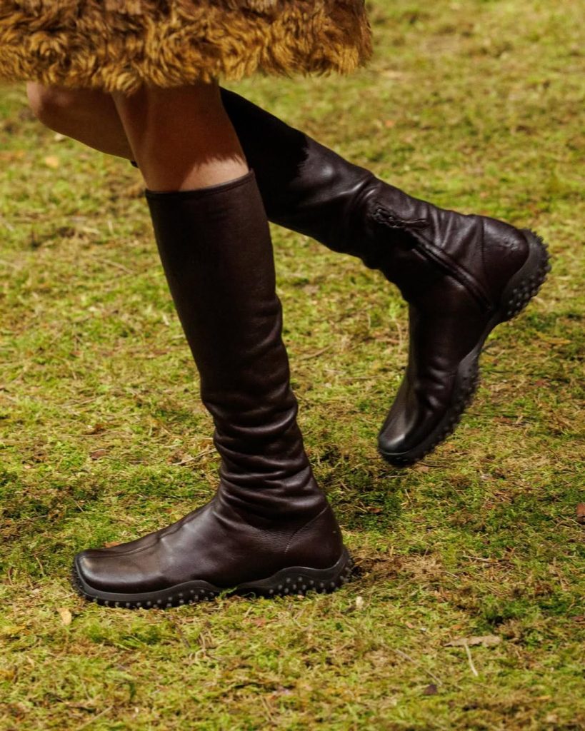 De son côté, Miuccia Prada regarde vers le passé pour imaginer l’hiver à venir. Lors du défilé Miu Miu automne-hiver — qui clôturait la Fashion Week de Paris — la créatrice a remis à l’honneur un détail emblématique de ses archives : la fameuse semelle technique à bulles apparue en 1999.