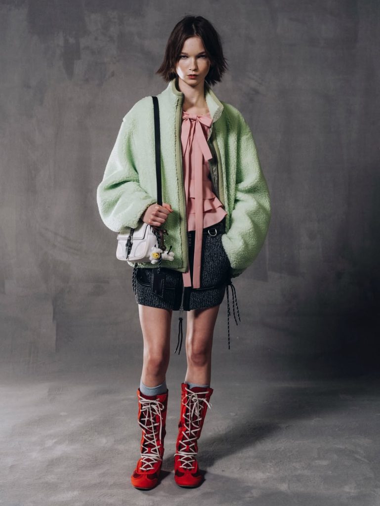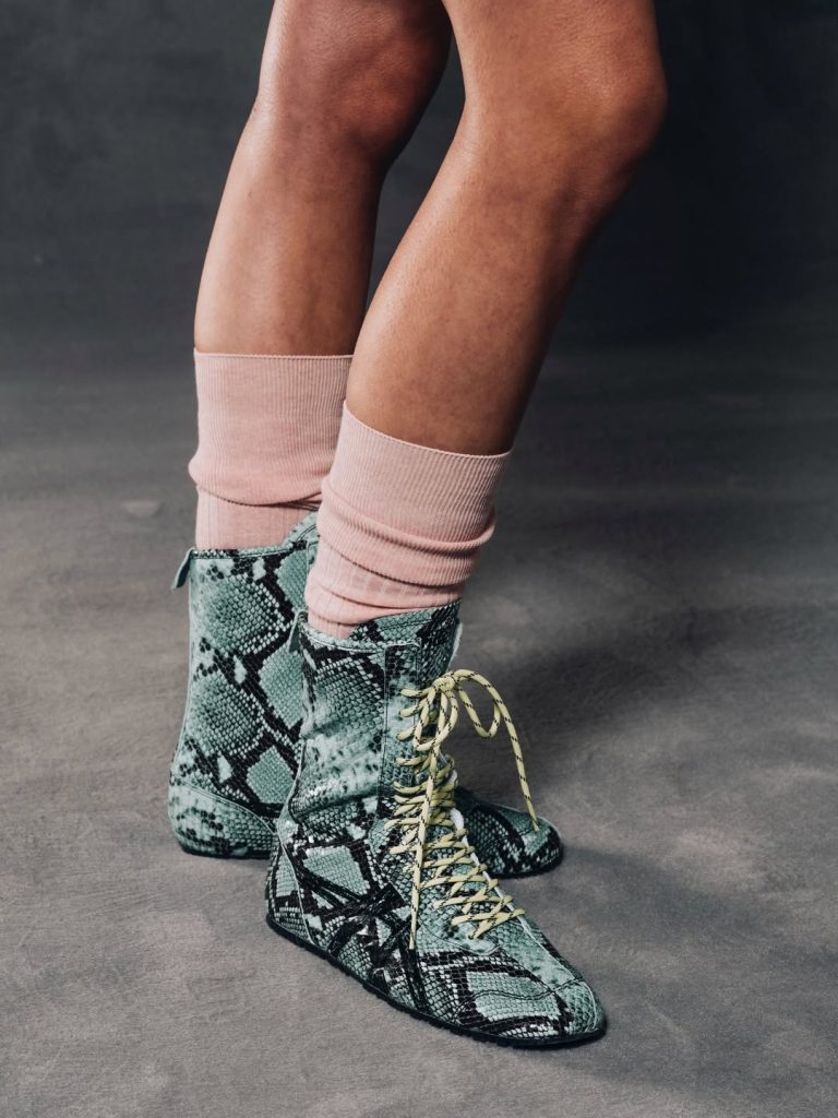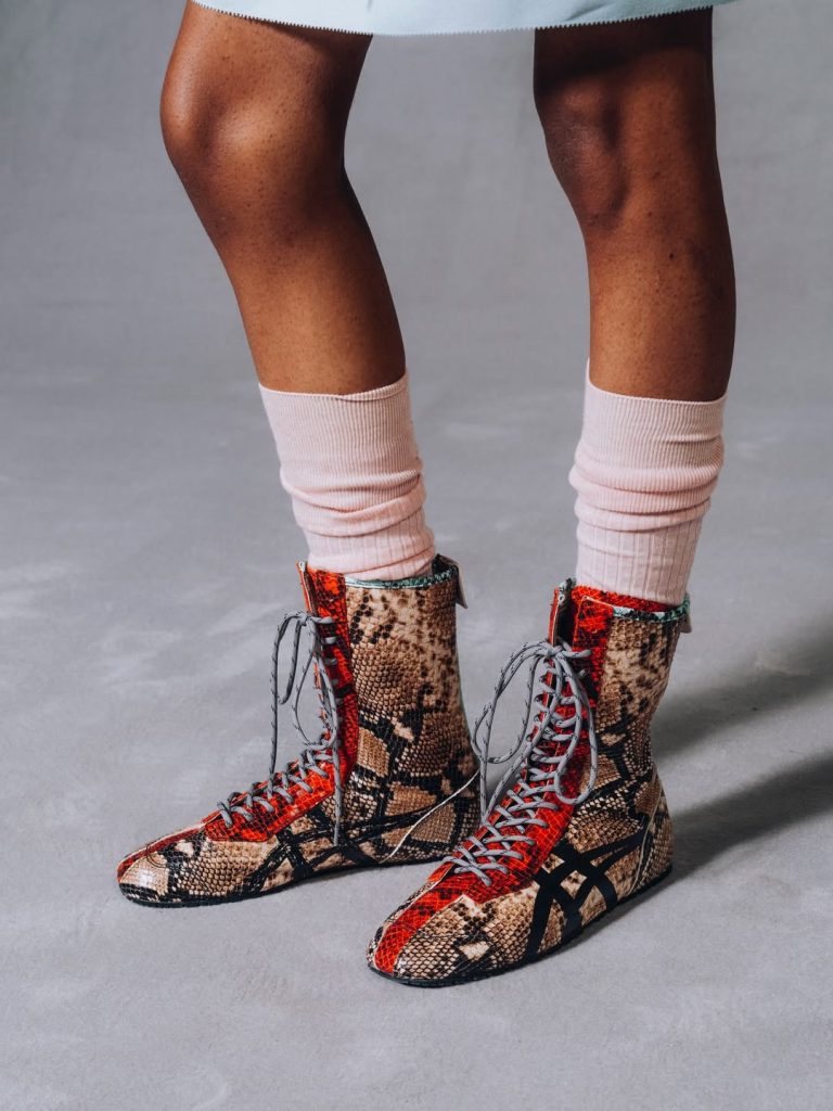 Avec cette idée en fil conducteur, la marque affirme sa volonté d’accompagner tous les moments de la vie, des occasions les plus spéciales au quotidien le plus ordinaire. Une philosophie qui se reflète particulièrement dans les chaussures : des sneakers au confort affirmé, revisitées dans des versions montantes — comme l’emblématique Mexico 66 réinterprétée façon boxing — parées d’imprimés reptiles, l’un des motifs phares de l’année. Une manière d’arpenter la ville avec des pièces à la fois pratiques et pointues. Côté styling, les silhouettes jouent sur un mélange d’influences : couleurs vives, teintes pastel et motifs floraux composent des looks qui évoquent parfois simultanément l’adolescence et l’élégance de femmes plus âgées. De cette rencontre inattendue se dégage une certaine mélancolie, comme un dialogue entre les âges et les temporalités.