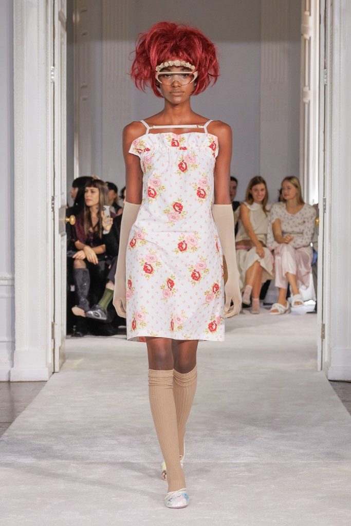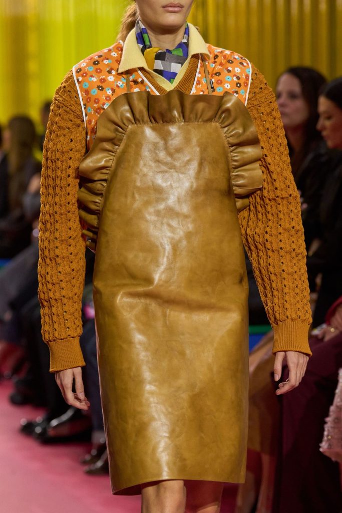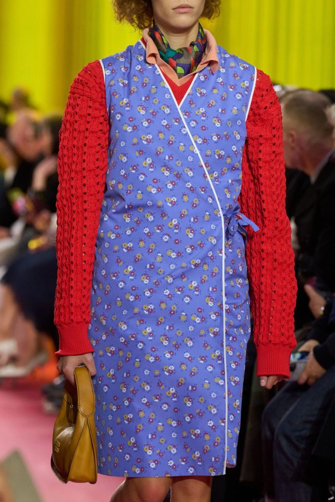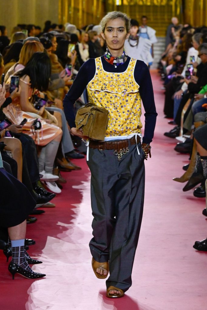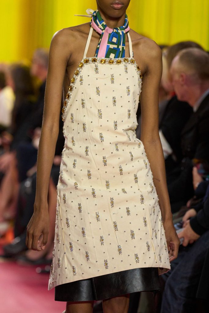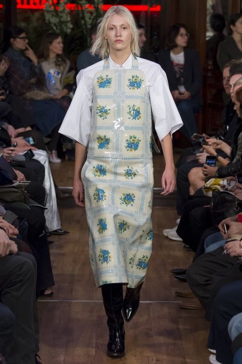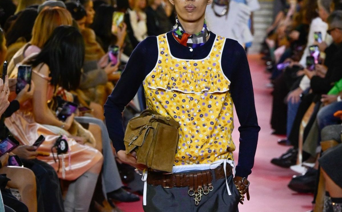 Mais Miu Miu détourne totalement ces références. Ici, le tablier ne protège plus : il se porte près du corps, comme une tunique revendicatrice.